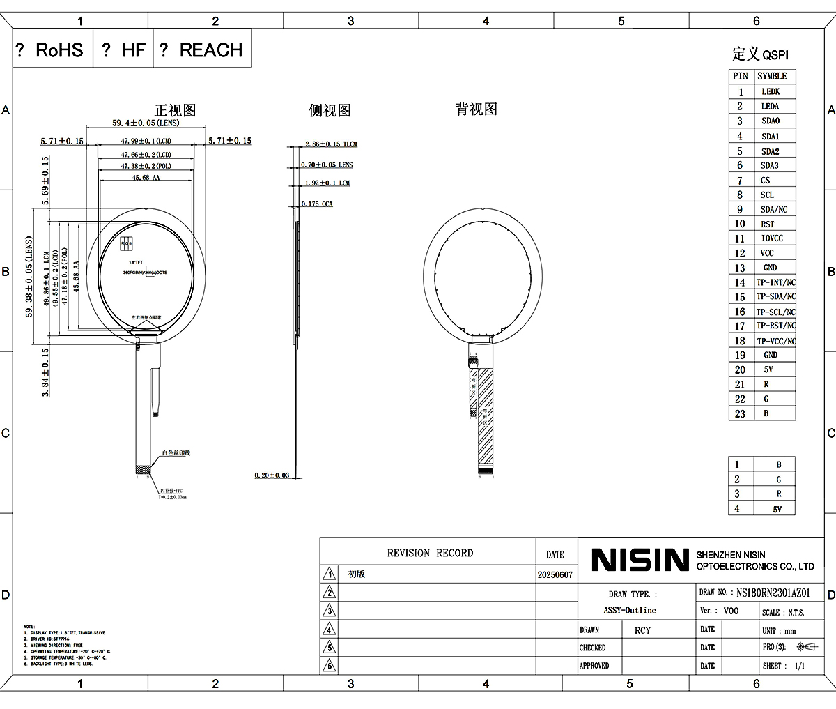 | 外形尺寸 | LCM Dimensions | 59.4*59.38*2.86mm | |