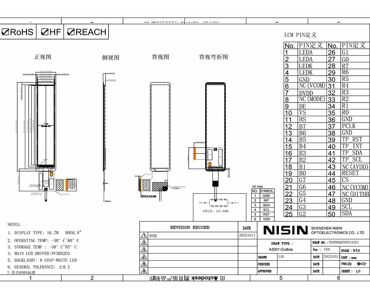 | 总成外形尺寸 | OD of the LCD Display Assembly | 42.2*191.47*5.13mm | |