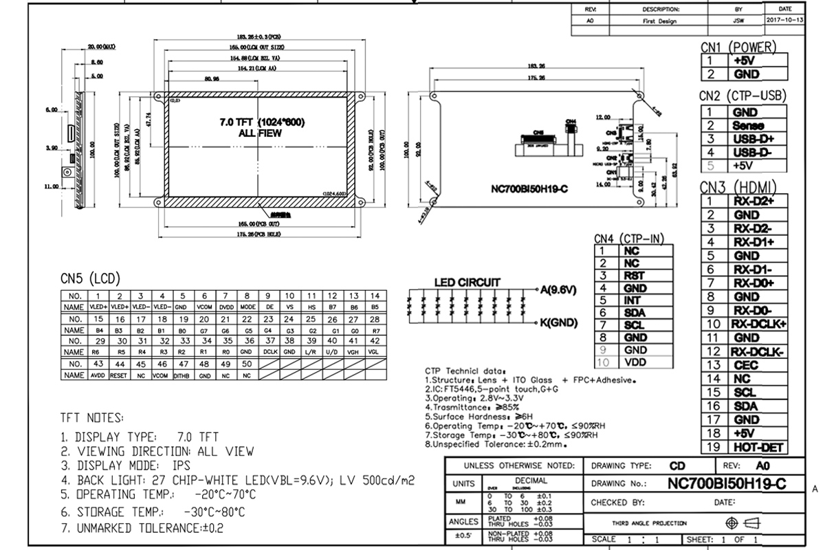 | 7寸 1024*600 TFT HDMI 显示控制模组 | LCD 显示屏尺寸(对角线) | LCD Display Size(Diagonal) | 7.0 英寸 |