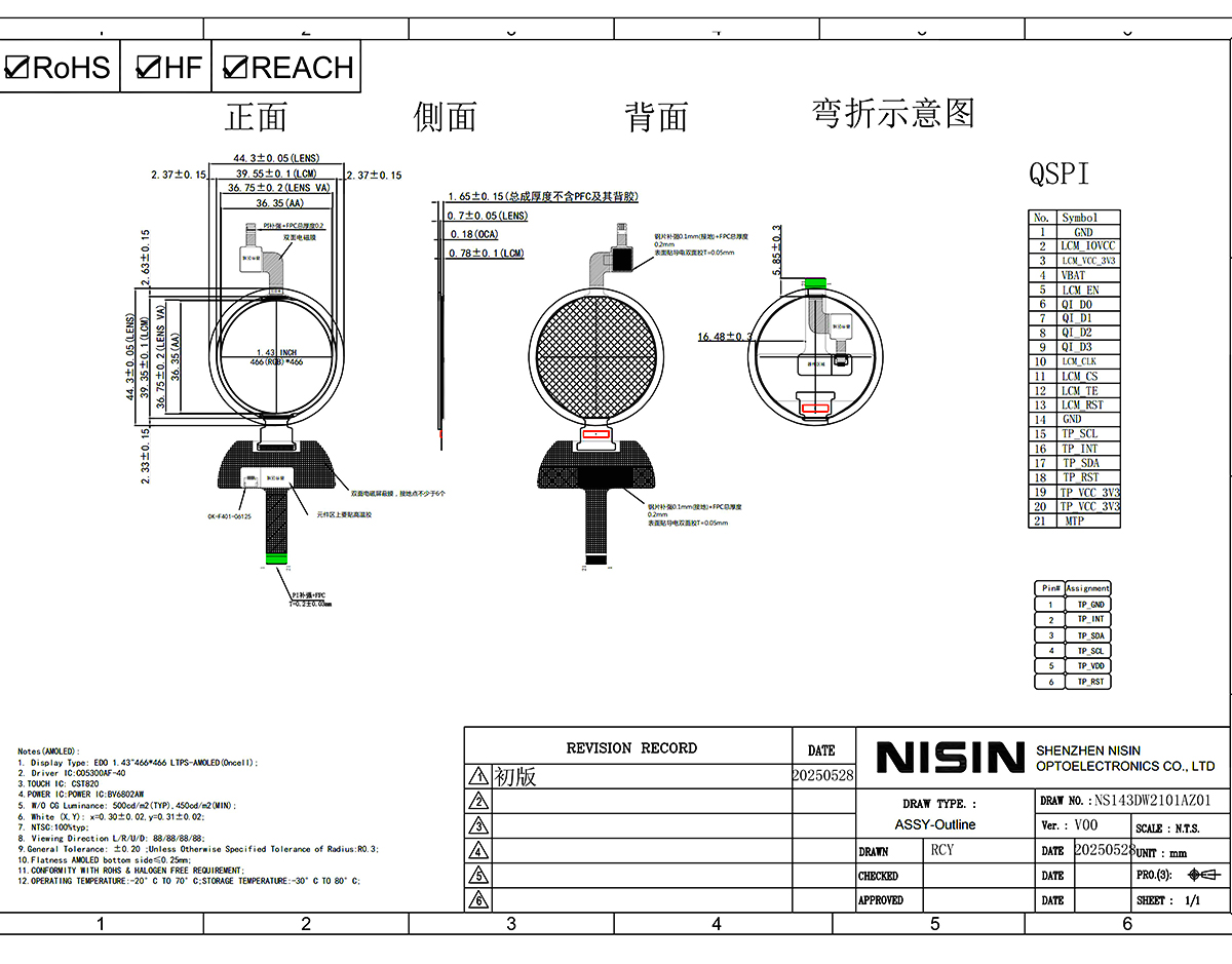 | 1.43寸 466*466 AMOLED 触摸串口屏 | 尺寸 | 1.43寸 |