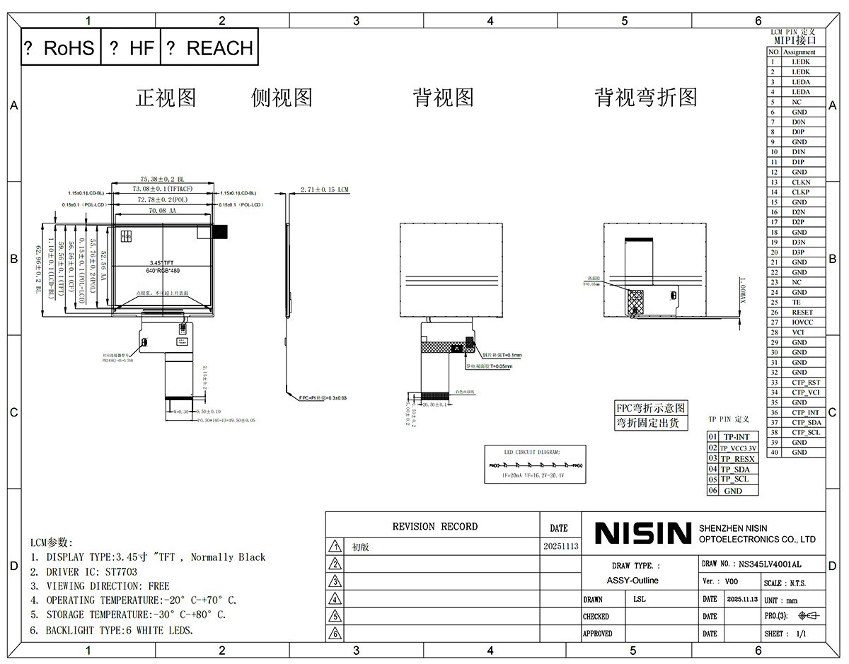 显示区尺寸为70.08×52.56mm,LCM外形仅75.38×62.96×2.71mm,厚度仅2.71mm,便于嵌入空间受限的设备。例如,便携式医疗检测仪、手持式工业仪表等场景,需在有限体积内集成高分辨率显示模块,该产品可完美满足需求。
