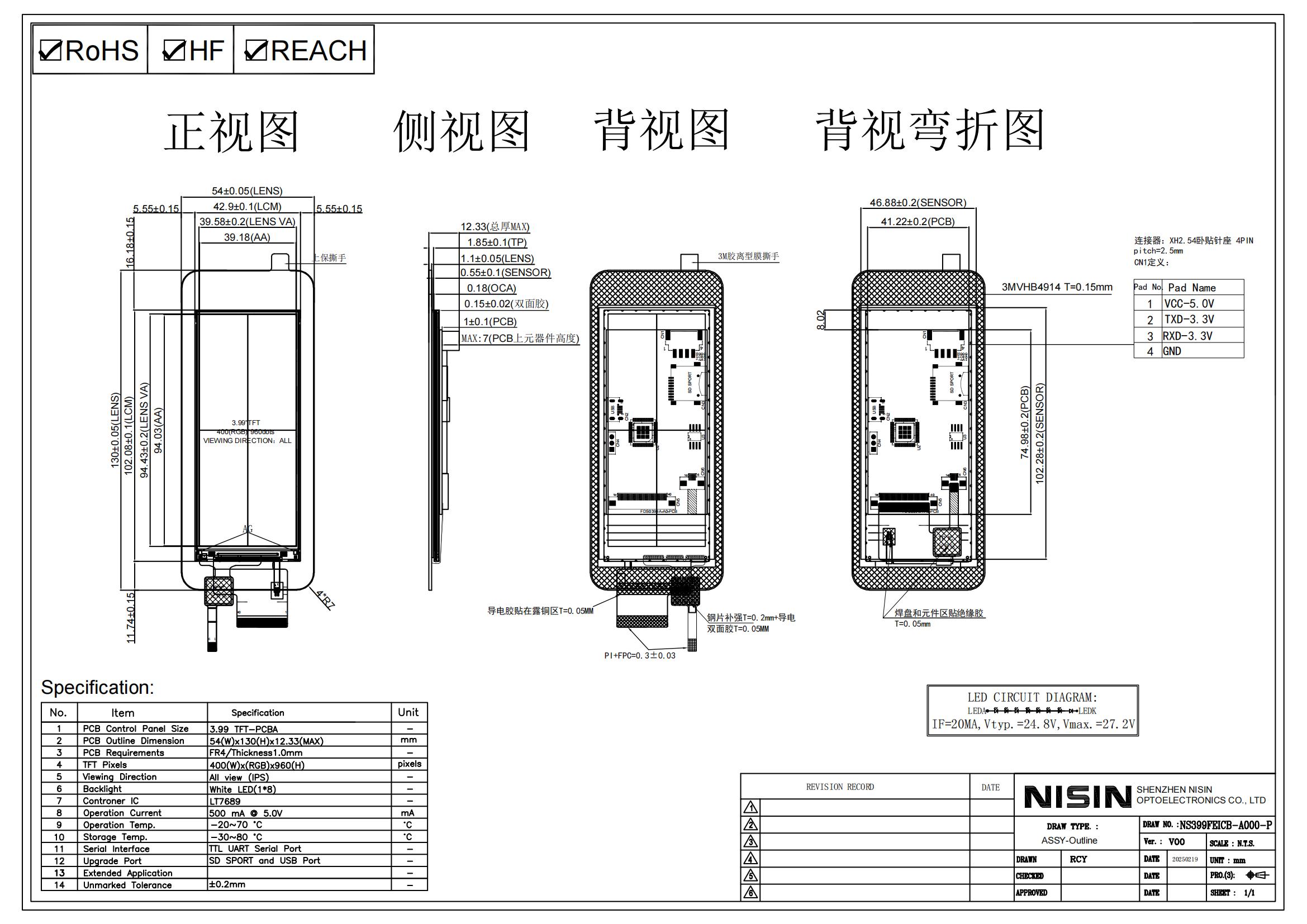 | 串口屏尺寸 | Serial port display dimensions | 54.0*130.0*12.33mm | |