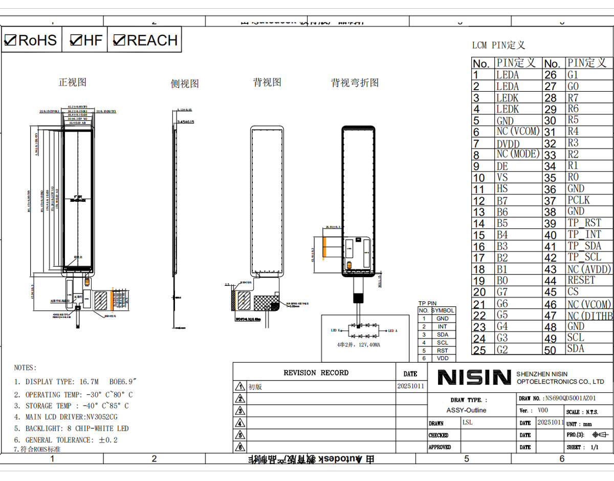 型号:6.9寸280*1424长条形高清TFT液晶显示模组总成