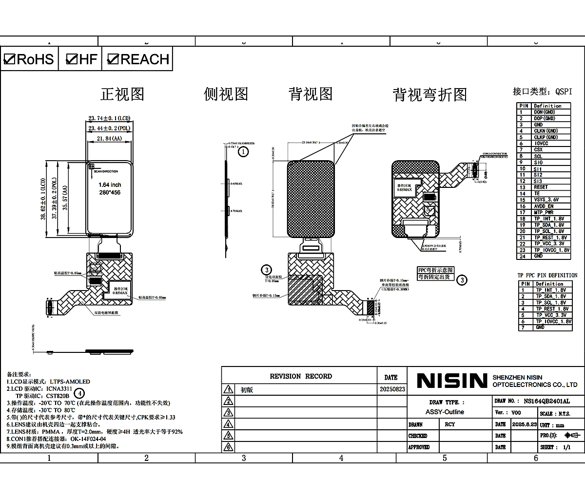 | 1.64寸 280*456 带触摸 AMOLED 显示屏 | 分辨率 | Resolution | 280*456 |